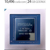 هستهی GPU در این کارتِ غولپیکر، از تراشهی GA102 با تعداد ۱۰۴۹۶ واحد گرافیکی (CUDA Cores) تشکیل شده که ۸۲ واحد پردازشی مستقل (SM Units) در GPU را در برمیگیرد. همچنین حافظهی گرافیکی این کارت دارای عرض باند ۳۸۴ بیتی و ظرفیت بسیار بالای ۲۴ گیگابایتی است. این میزان حافظهی گرافیکی رکوردی جدید محسوب میشود و برای اولین بار است که استفاده از این حجم از حافظهی گرافیکی را در یک کارت گرافیک مخصوص بازی شاهد هستیم.